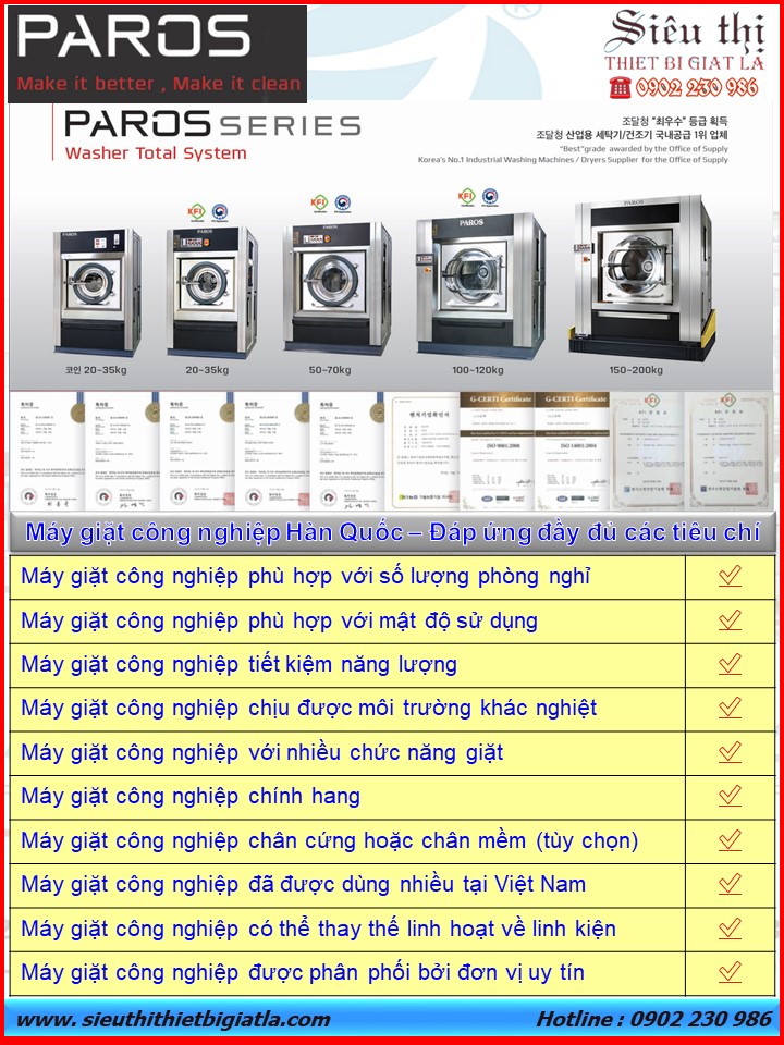 Máy giặt công nghiệp Paros là một thương hiệu máy giặt công nghiệp đến từ Hàn Quốc, được biết đến với chất lượng cao, hiệu quả giặt ủi tốt và giá cả cạnh tranh.